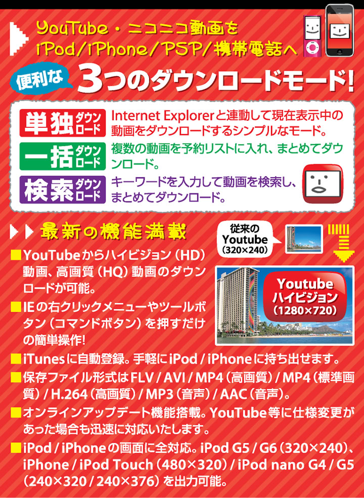 YouTube、ニコニコ動画はもちろん、DVDやハイビジョンビデオ・携帯カメラ動画もiPod/iPhone/PSPなどに持ち出せる!